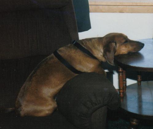 Here’s Teddy sitting up in “his” chair, sleeping. He thinks he is human and will sit up in the recliner and lean on the arm. |